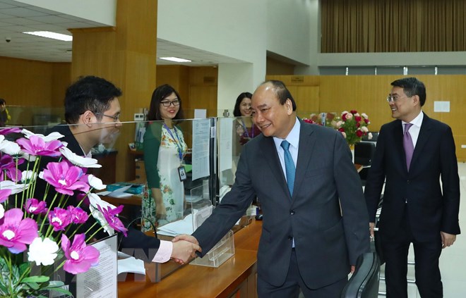 | Thủ tướng Nguyễn Xuân Phúc đến thăm, chúc Tết cán bộ, viên chức, người lao động Ngân hàng Chính sách xã hội trong ngày làm việc đầu tiên của Xuân Kỷ Hợi 2019. (Ảnh: Thống Nhất/TTXVN) |