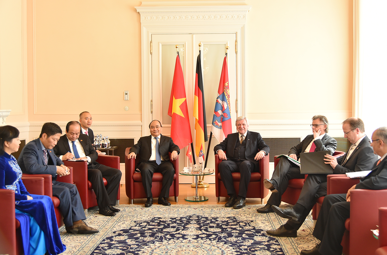 Thủ tướng Chính phủ Nguyễn Xuân Phúc đánh giá quan hệ Đối tác chiến lược Việt Nam-Đức đang phát triển sâu rộng, hiệu quả ở cả cấp Liên bang và cấp bang; khẳng định bang Hessen đang đóng vai trò quan trọng trong việc phát triển quan hệ Việt Nam-Đức, đặc biệt là về kinh tế và thương mại với kim ngạch thương mại hai chiều giữa Việt Nam và bang Hessen đạt gần 700 triệu Euro quý I/2017. Thủ tướng đề nghị Chính quyền bang Hessen tiếp tục hỗ trợ, khuyến khích các doanh nghiệp bang sang Việt Nam đầu tư kinh doanh, đồng thời đề nghị chính quyền bang ủng hộ và tạo điều kiện thuận lợi cho các doanh nghiệp Việt Nam như Vietinbank, FPT... hoạt động hiệu quả tại bang. Thủ tướng khẳng định Chính phủ Việt Nam luôn ủng hộ, tạo môi trường thuận lợi để các doanh nghiệp Đức nói chung và bang Hessen nói riêng sang đầu tư, kinh doanh lâu dài và ổn định tại Việt Nam và đề nghị các địa phương của hai bên tăng cường hợp tác và chia sẻ kinh nghiệm trong các lĩnh vực mà hai bên quan tâm.