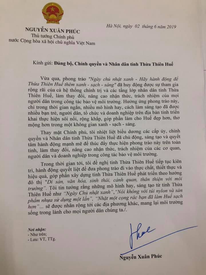 Trong thư, Thủ tướng viết “Vừa qua, phong trào Ngày chủ nhật xanh-Hãy hành động để Thừa Thiên-Huế thêm xanh-sạch-sáng” đã huy động được sự tham gia rộng rãi của cả hệ thống chính trị và các tầng lớp nhân dân, làm thay đổi, nâng cao nhận thức, trách nhiệm của mọi người dân trong công tác bảo vệ môi trường. Hưởng ứng phong trào này, chỉ trong thời gian ngắn, nhiều mô hình hay, cách làm sáng tạo đã được nhiều bạn trẻ, người dân, tổ chức và doanh nghiệp trên địa bàn tỉnh triển khai thực hiện sôi nổi, rộng khắp, góp phần làm cho Huế đẹp hơn, thơ mộng hơn trong một không gian – xanh - sạch – sáng.