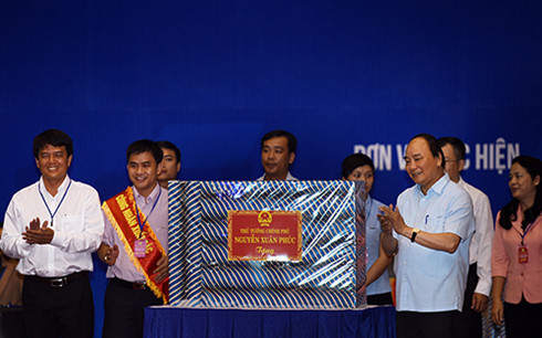 | Thay mặt Chính phủ, Thủ tướng Nguyễn Xuân Phúc tặng quà cho đại diện công nhân tại các khu công nghiệp - Ảnh: Quang Hiếu |