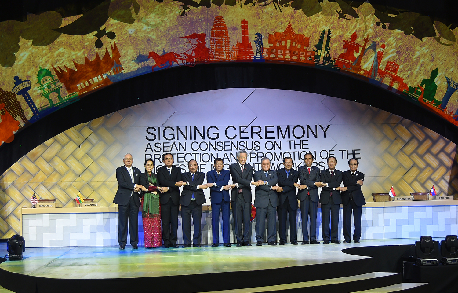 | Thủ tướng Nguyễn Xuân Phúc dự lễ ký kết Đồng thuận ASEAN về bảo vệ và thúc đẩy quyền của người lao động di cư. Ảnh: VGP/Quang Hiếu |
