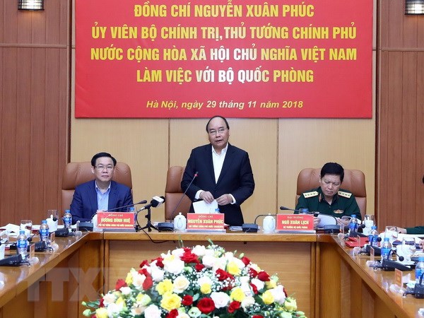 | Thủ tướng Nguyễn Xuân Phúc làm việc với lãnh đạo Bộ Quốc phòng. (Ảnh: Thống Nhất/TTXVN) |