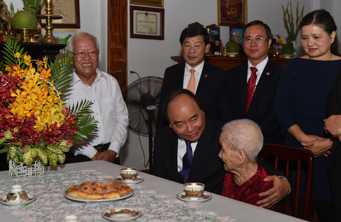 Thủ tướng Nguyễn Xuân Phúc cũng đã tới thăm hỏi, tặng quà cụ bà Lê Thị Não, 95 tuổi, cựu chiến binh bị địch bắt, tù đày hiện đang sinh sống tại xã Tân Bình, huyện Dĩ An.