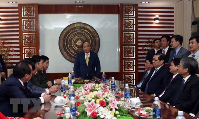 Thủ tướng Chính phủ Nguyễn Xuân Phúc đến thăm, chúc Tết các lực lượng vũ trang thành phố Đà Nẵng. (Ảnh: Trần Lê Lâm/TTXVN)