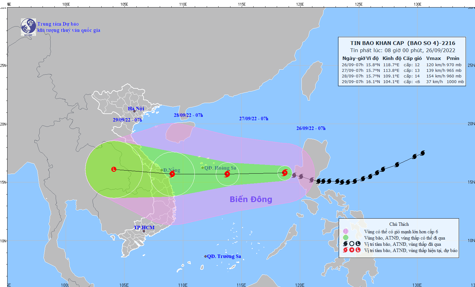 Sáng sớm ngày 26/9, bão Noru đã đi vào Biển Đông, trở thành cơn bão số 4 năm 2022. Theo dự báo của Trung tâm Dự báo khí tượng thủy văn quốc gia, đây là cơn bão có cường độ rất mạnh, sức gió rất mạnh cấp 13-14, giật cấp 16, tốc độ di chuyển nhanh, dự báo từ ngày 26/9, bão gây gió mạnh, sóng lớn trên vùng biển giữa và bắc Biển Đông, chiều tối ngày 27/9, bão sẽ ảnh hưởng trực tiếp đến vùng ven biển và đổ bộ vào đất liền khu vực Trung Bộ, trọng tâm là từ Quảng Trị đến Bình Thuận, gây mưa lớn tập trung ở Bắc Trung Bộ, Trung Trung Bộ và Bắc Tây Nguyên.