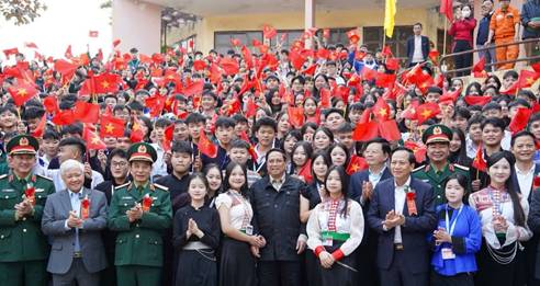 Thủ tướng Chính phủ Phạm Minh Chính; ông Đỗ Văn Chiến, Đại tướng Phan Văn Giang và các đại biểu chụp ảnh cùng học sinh Trường Phổ thông vùng cao Việt Bắc.