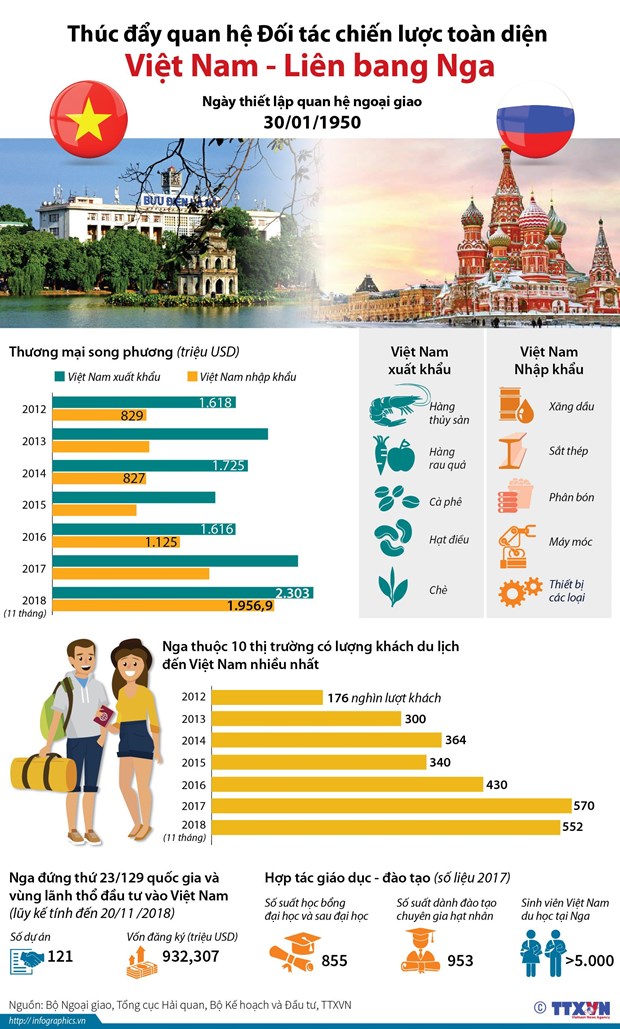 Năm 2012, Việt Nam chỉ đón 176.000 lượt khách du lịch Nga, đến năm 2018 con số này đã tăng lên 606.000 lượt khách, đưa Nga trở thành thị trường du lịch lớn nhất châu Âu của Việt Nam. Cộng đồng người Việt với gần 10.000 người đang sinh sống làm ăn kinh doanh tại Nga, luôn gắn bó và coi Nga là quê hương thứ hai của mình, hàng ngàn lưu học sinh Việt Nam đang được đào tạo tại các cơ sở giáo dục uy tín của Nga. Mối quan hệ giao lưu hữu nghị giữa nhân dân hai nước là sợi dây bền chặt gắn kết hai quốc gia, góp phần không ngừng củng cố và phát triển quan hệ Đối tác chiến lược toàn diện Việt Nam-Nga…/.