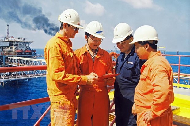 | Cán bộ, chuyên gia Nga và Việt Nam trên giàn khoan dầu khí ở ngoài khơi Vũng Tàu. (Nguồn: TTXVN) |