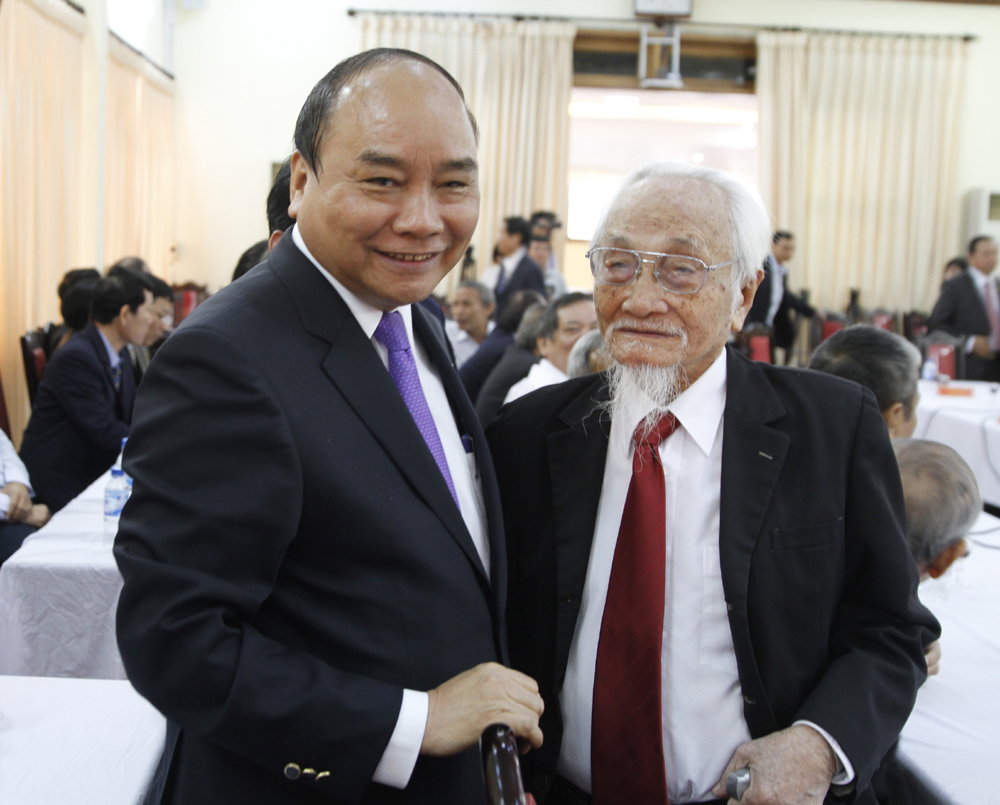 Thủ tướng cùng một đồng chí nguyên lãnh đạo tỉnh Quảng Ngãi. - Ảnh: VGP/Hồng Hạnh