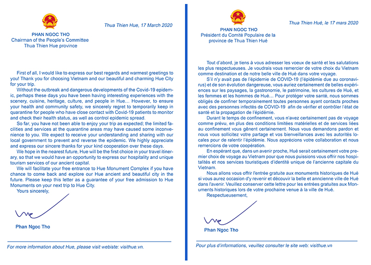 “Lần tới Ông/Bà đến thăm và khám phá thành phố Huế cổ kính xinh đẹp, chúng tôi sẽ tạo điều kiện để Ông/Bà được tham quan miễn phí Quần thể di tích cố đô Huế. Vui lòng giữ lá thư này để được miễn phí vào cổng khi đến thăm các di tích trong những chuyến du lịch tiếp theo”, ông Thọ viết trong thư.