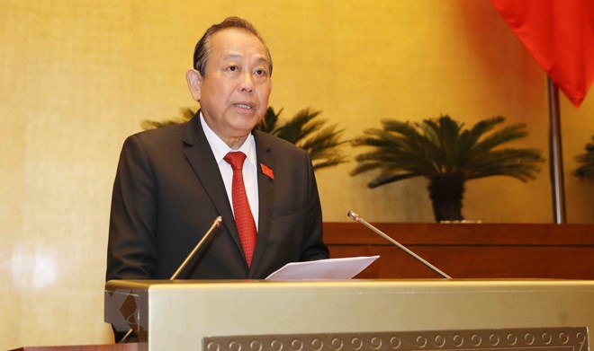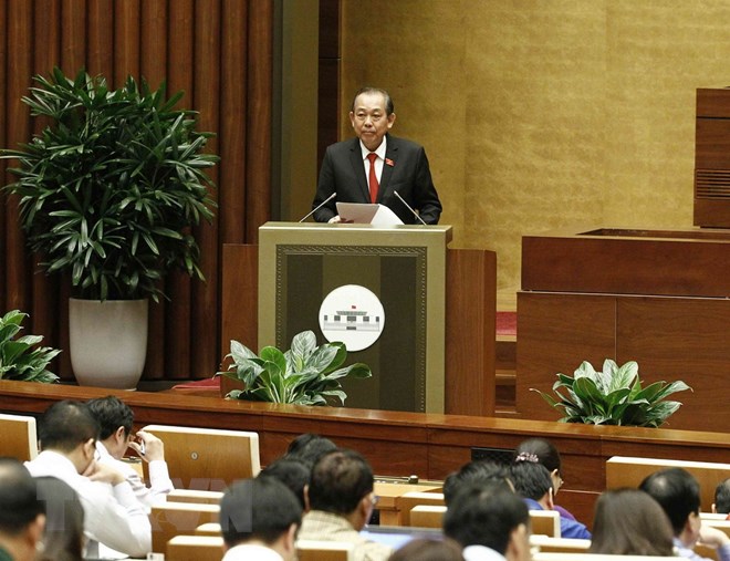 | Phó Thủ tướng Thường trực Chính phủ Trương Hòa Bình trình bày Báo cáo việc thực hiện các nghị quyết của Quốc hội về hoạt động giám sát chuyên đề, chất vấn tại kỳ họp từ đầu nhiệm kỳ đến hết kỳ họp thứ tư, Quốc hội khóa XIV. (Ảnh: Phương Hoa/TTXVN) |
