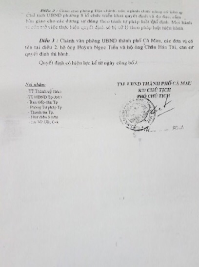 Sau khi tiếp nhận đơn tranh chấp đất giữa hộ ông Huỳnh Ngọc Tiễn với hộ ông Châu Hán Tài, ngày 21/8/2000, UBND TP. Cà Mau ban hành quyết định số 1197/QĐ-UB có nội dung: Nay thừa nhận phần đất có diện tích 43,24m2 hiện hộ ông Châu Hán Tài đang sử dụng, tọa lạc tại khóm 8, phường 8, TP. Cà Mau là của hộ ông Huỳnh Ngọc Tiễn. Xét hộ ông Tiễn đã có chỗ ở ổn định và hộ ông Châu Hán Tài, có nhu cầu sử dụng nên giữ nguyên hiện trạng phần đất cho ông Châu Hán Tài. Trong Quyết định của UBND TP. Cà Mau, còn buộc hộ Châu Hán Tài, có trách nhiệm trả tiền sử dụng đất cho hộ Huỳnh Ngọc Tiễn theo khung giá Nhà nước hiện hành, trừ lại công bồi đắp cho hộ Châu Hán Tài 5%, số tiền phải trả là 44.364.240 đồng.