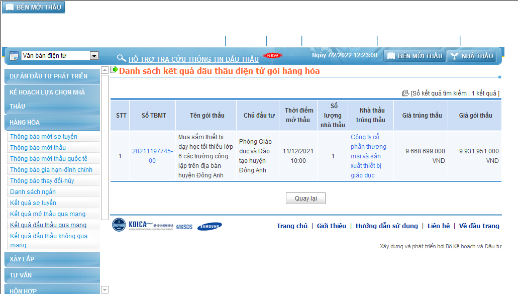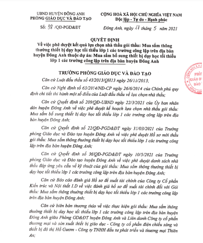 Theo đó đơn vị được phê duyệt trúng thầu là liên danh Công ty CP thương mại và sản xuất thiết bị Giáo Dục - Công ty CP điện chiếu sáng và thiết bị đô thị Hồ Gươm, Công ty TNHH đầu tư phát triển và thương mại Thiên Ân với giá 12.896.189.000 đồng theo quyết định số 38/QĐ-PGD&ĐT ngày 17/5/2021 do bà Dương Thị Sáu, Trưởng phòng GD&ĐT huyện Đông Anh ký (giá gói thầu là 13.005.000.000 đồng).