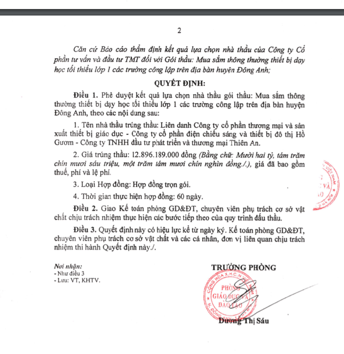 Quyết định phê duyệt trúng thầu do bà Dương Thị Sáu, Trưởng phòng GD&ĐT huyện Đông Anh ký.