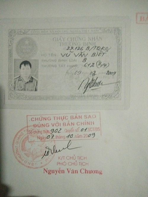 | Giấy chứng nhận thương binh 2/4 của ông Vũ Văn Biết |