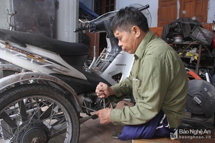 | Ông Cảnh đang sửa xe ba bánh cho người khuyết tật. Ảnh: Xuân Hòa |
