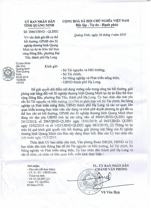Cuối cùng đến ngày 26/4/2019 UBND tỉnh Quảng Ninh đã ban hành Văn bản số 2886/UBND – QLĐĐ2 gửi Sở Tài nguyên và Môi trường.