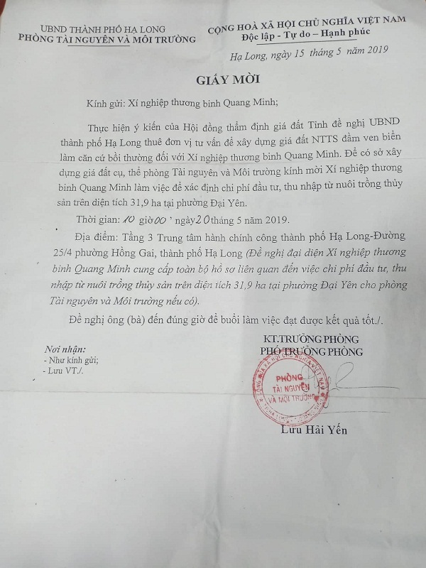 Qua nhiều buổi làm việc, đại diện Xí nghiệp cho biết: " Chúng tôi nhận thấy, tỉnh Quảng Ninh đã có nhiều văn bản khẳng định giao cơ quan chức năng trong tỉnh giải quyết dứt điểm trước tháng 1/2019 nhưng nay đã quá nhiều tháng mà vẫn không có kết quả.Hiện giấy tờ của chúng tôi đã chuyển đi chuyển lại gần 10 năm, Bộ Tài nguyên Môi trường đã xem xét và có văn bản công nhận đất mà tỉnh Quảng Ninh thu hồi của Xí nghiệp đủ điều kiện đền bù và giá đền bù tính tại thời điểm bồi thường".