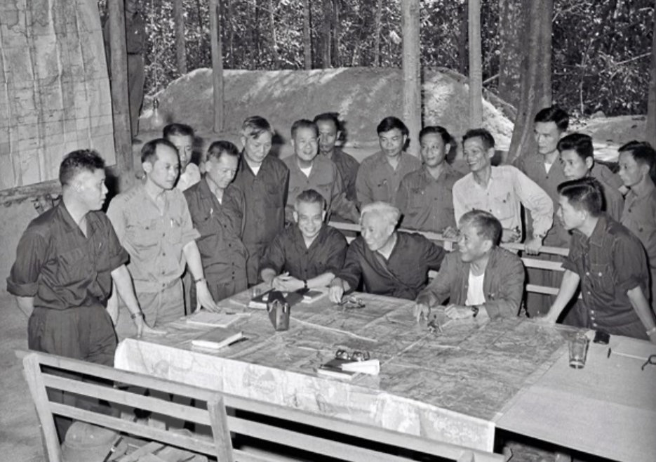 Từ trái sang: Phó Tư lệnh Trần Văn Trà, đại diện Bộ Chính trị tại Mặt trận Lê Đức Thọ, Tư lệnh Văn Tiến Dũng, Chính ủy Phạm Hùng, Phó Tư lệnh Đinh Đức Thiện trong Bộ Chỉ huy Chiến dịch Hồ Chí Minh (Lộc Ninh, tháng 4/1975). Ảnh tư liệu.