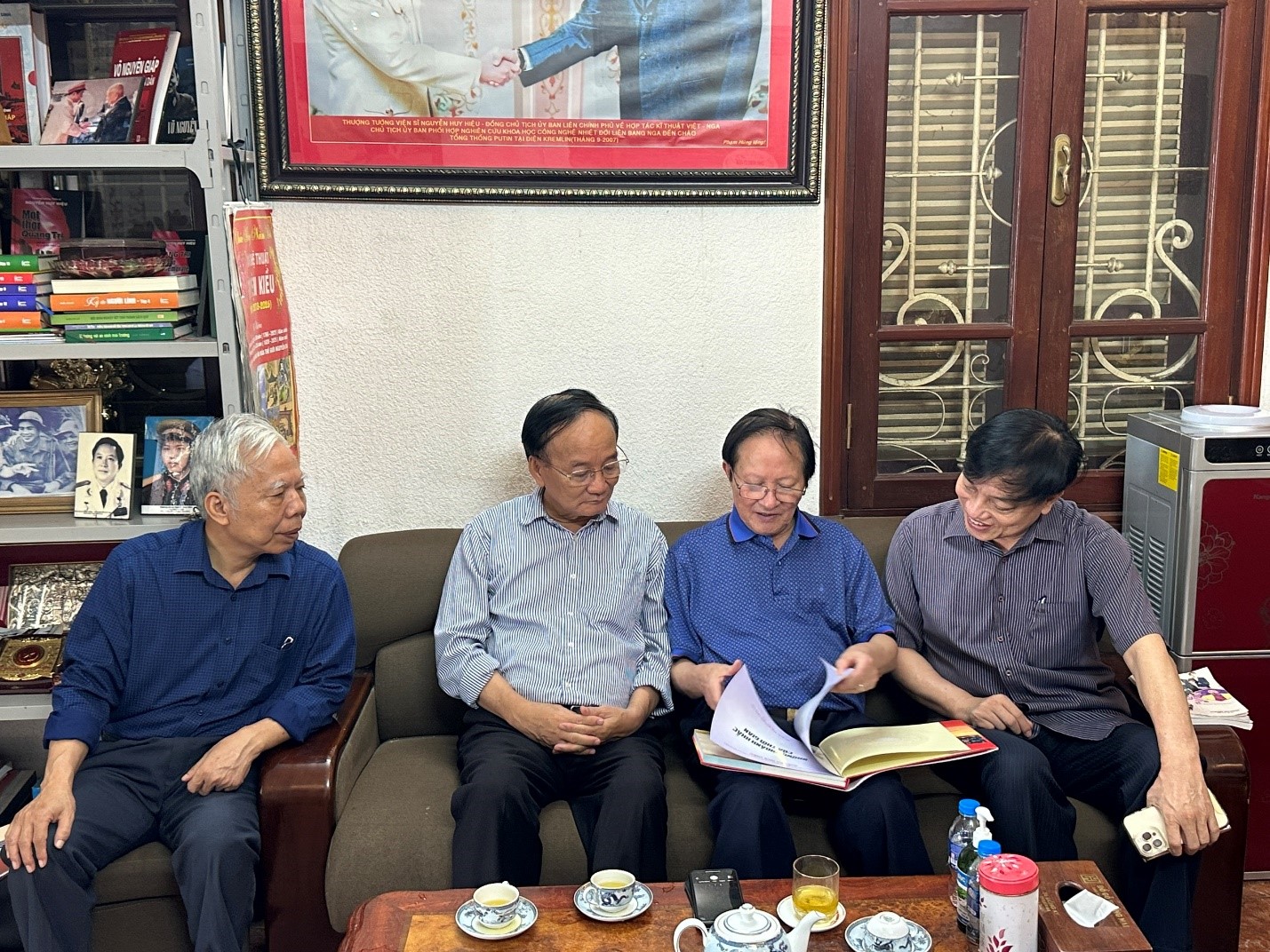 Thượng tướng Nguyễn Huy Hiệu chia sẻ một số cuốn sách với ông Nguyễn Xuân Hải - Tổng biên tập tạp chí Việt Đức ( bên phải), ông Lê Quang Vinh và ông Trần Đăng Sinh ( bên trái)- Ban đầu tư bạn đọc tạp chí Việt Đức.