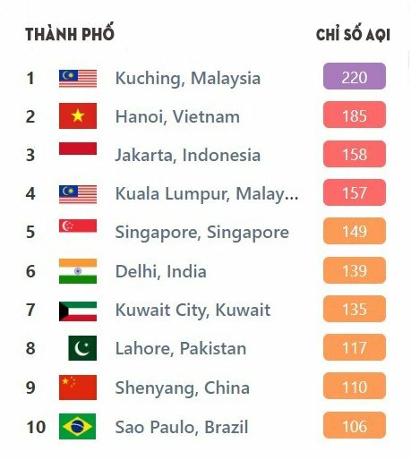 | Xếp hạng chỉ số chất lượng không khí AQI ngày 17/9 của các thành phố trên thế giới, Hà Nội ở vị trí thứ hai. |