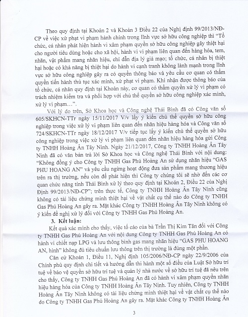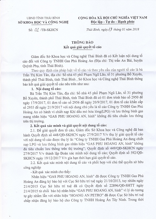 Tại mục 3, Thông báo số 02 ngày 19/01/2018, Sở KHCN đã có Kết luận như sau: “Kết quả xác minh cho thấy, việc tố cáo của bà Trần Thị Kim Tân đối với Công ty TNHH Gas Phú Hoàng An với nội dung Công ty TNHH Gas Phú Hoàng An có hành vi chiết nạp LPG và lưu thông bình gas mang nhãn hiệu “GAS PHU HOANG AN, hình” không đủ tiêu chuẩn lưu thông trên thị trường là đúng một phần”.
