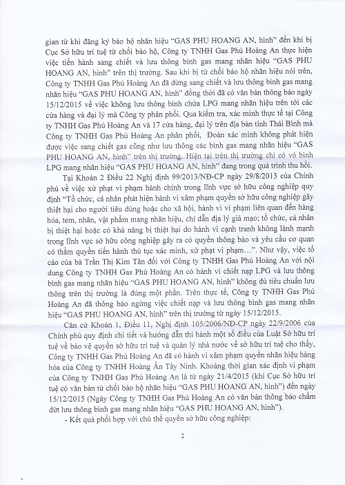 4.4. Giao Thanh tra sở chủ động nắm bắt và kịp thời xử lý trong trường hợp Công ty TNHH Gas Phú Hoàng An tiếp tục kinh doanh sản phẩm gas mang nhãn hiệu “GAS PHÚ HOÀNG AN, hình” đồng thời thông báo với Công ty TNHH Hoàng Ân Tây Ninh để thực hiện quyền đối với nhãn hiệu theo quy định tại Nghị định 99/2013/NĐ-CP” (trích Thông báo Kết quả giải quyết tố cáo số 02 ngày 19/1/2018).