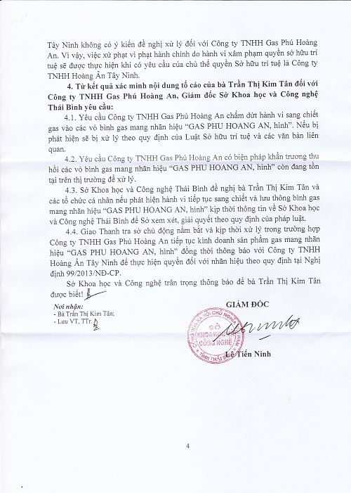 4.3. Sở Khoa học và Công nghệ Thái Bình đề nghị bà Trần Thị Kim Tân và các tổ chức cá nhân nếu phát hiện hành vi tiếp tục sang chiết và lưu thông bình gas mang nhãn hiệu “GAS PHÚ HOÀNG AN, hình” kịp thời thông tin về Sở Khoa học và Công nghệ Thái Bình để Sở xem xét, giải quyết theo quy định của pháp luật.