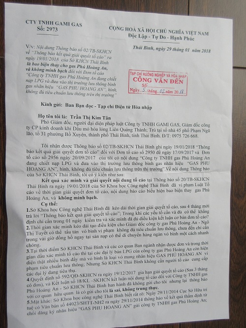 HOANHAP.VN - Sau khi bài “Công ty TNHH Gas Phú Hoàng An có hoạt động kinh doanh trái pháp luật…?” được đăng tải ngày 17/01/2018 trên trang hoanhap.vn và “Công văn Phúc đáp của Sở Khoa học và Công nghệ Thái Bình” đăng ngày 29/1/2018, thì ngày 05/02/2018, Tạp chí điện tử Hòa nhập (sau đây gọi tắt là Tạp chí) nhận được công văn số 2973 ngày 29/01/2018 của Công ty TNHH GAMI GAS do Phó giám đốc Trần Thị Kim Tân ký.