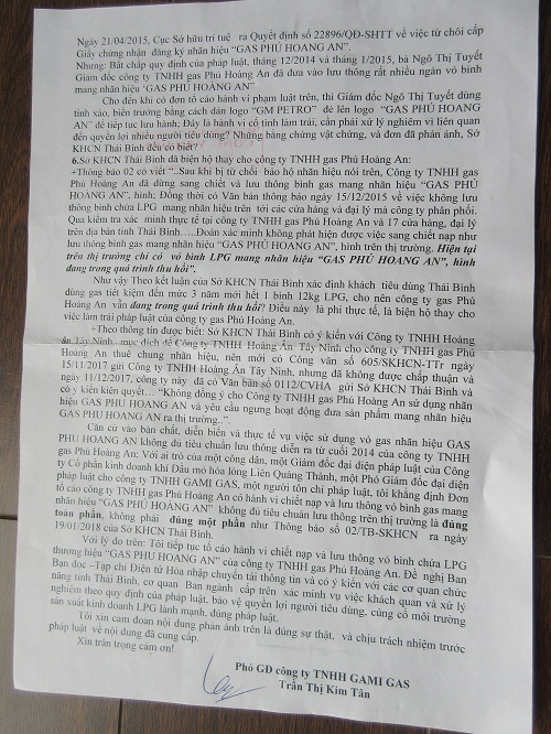 Căn cứ vào bản chất, diễn biến và thực tế vụ việc sử dụng vỏ gas nhãn hiệu GAS PHU HOANG AN không đủ tiêu chuẩn lưu thông diễn ra từ cuối 2014 của Công ty TNHH gas Phú Hoàng An, bà Tân khẳng định Đơn tố cáo Công ty TNHH gas Phú Hoàng An có hành vi chiết nạp và lưu thông vỏ bình gas mang nhãn hiệu “GAS PHÚ HOÀNG AN” không đủ tiêu chuẩn lưu thông trên thị trường là đúng toàn phần, không phải đúng một phần như Thông báo số 02/TB-SKHCN ra ngày 19/01/2018 của Sở KHCN Thái Bình.