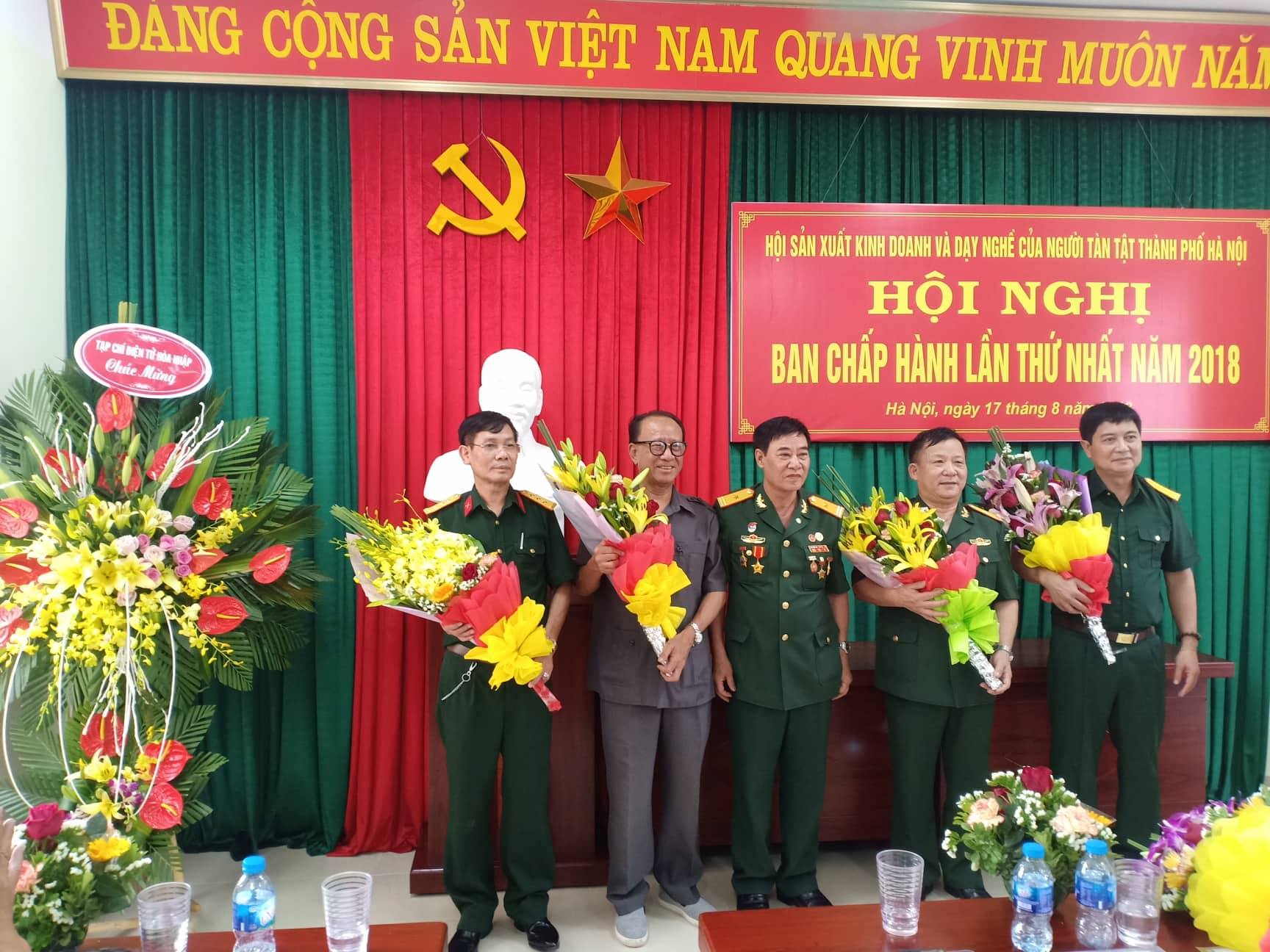 | Các đại biểu tặng hoa chúc mừng ông Nguyễn Văn Quỳnh - Chủ tịch Hội sản xuất kinh doanh và dạy nghề của người tàn tật thành phố Hà Nội nhiệm kỳ mới. |