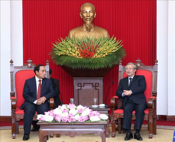 | Đồng chí Trần Quốc Vượng tiếp đồng chí Bounthong Chithmany. Ảnh: TTXVN |