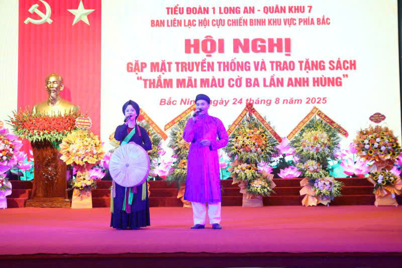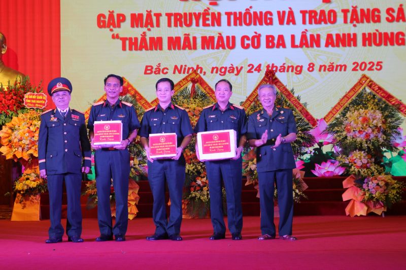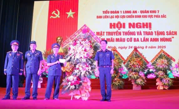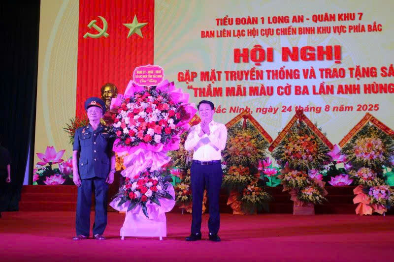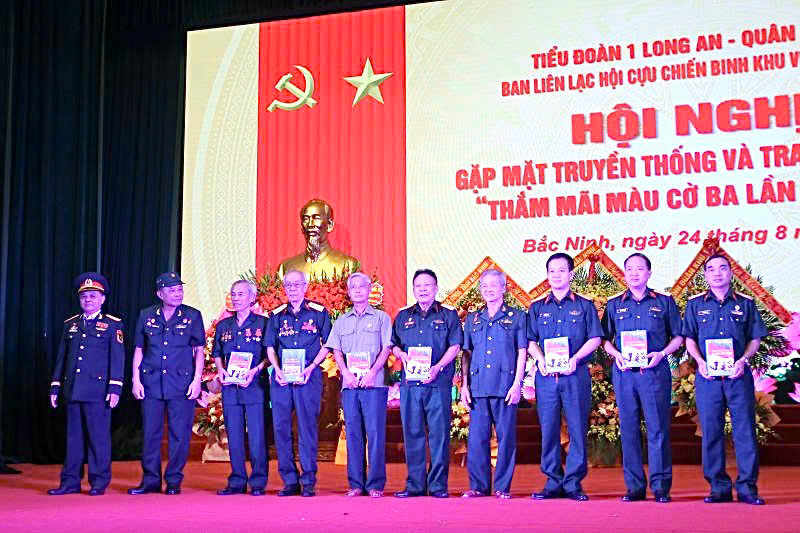 Tại buổi lễ, Ban liên lạc trao tặng cuốn sách “Thắm mãi màu cờ ba lần anh hùng” viết về Tiểu đoàn 1 Long An cho các đại biểu tham dự.