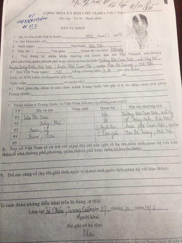 Theo khai nhận tại trụ sở công an, bé gái tên Mai, khoảng 12 - 13 tuổi, là người Việt Nam. Gia đình em gồm có 7 người: mẹ là Lưu Thị Mai; bố tên Dũng; 2 anh trai tên Xuân, Lý và 2 em gái tên Xoan, Giai.