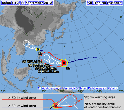 Hồi 13 giờ ngày 11/9, vị trí tâm bão ở vào khoảng 20,8 độ Vĩ Bắc; 118,0 độ Kinh Đông, cách đảo Hải Nam (Trung Quốc) khoảng 780km về phía Đông Đông Bắc.