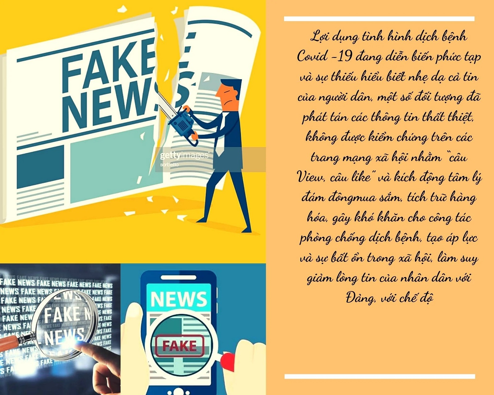 Đặc biệt, lợi dụng tình hình dịch bệnh Covid -19 đang diễn biến phức tạp và sự thiếu hiểu biết nhẹ dạ cả tin của người dân, một số đối tượng đã phát tán các thông tin thất thiệt, không được kiểm chứng trên các trang mạng xã hội nhằm “câu View, câu like” và kích động tâm lý đám đôngmua sắm, tích trữ hàng hóa, gây khó khăn cho công tác phòng chống dịch bệnh, tạo áp lực và sự bất ổn trong xã hội, làm suy giảm lòng tin của nhân dân với Đảng, với chế độ.