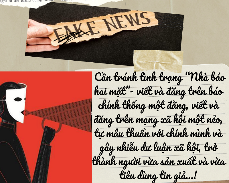 Ngoài ra, cần tránh tình trạng “Nhà báo hai mặt”- viết và đăng trên báo chính thống một đằng, viết và đăng trên mạng xã hội một nẻo, tự mâu thuẩn với chính mình và gây nhiễu dư luận xã hội, trở thành người vừa sản xuất và vừa tiêu dùng tin giả…!