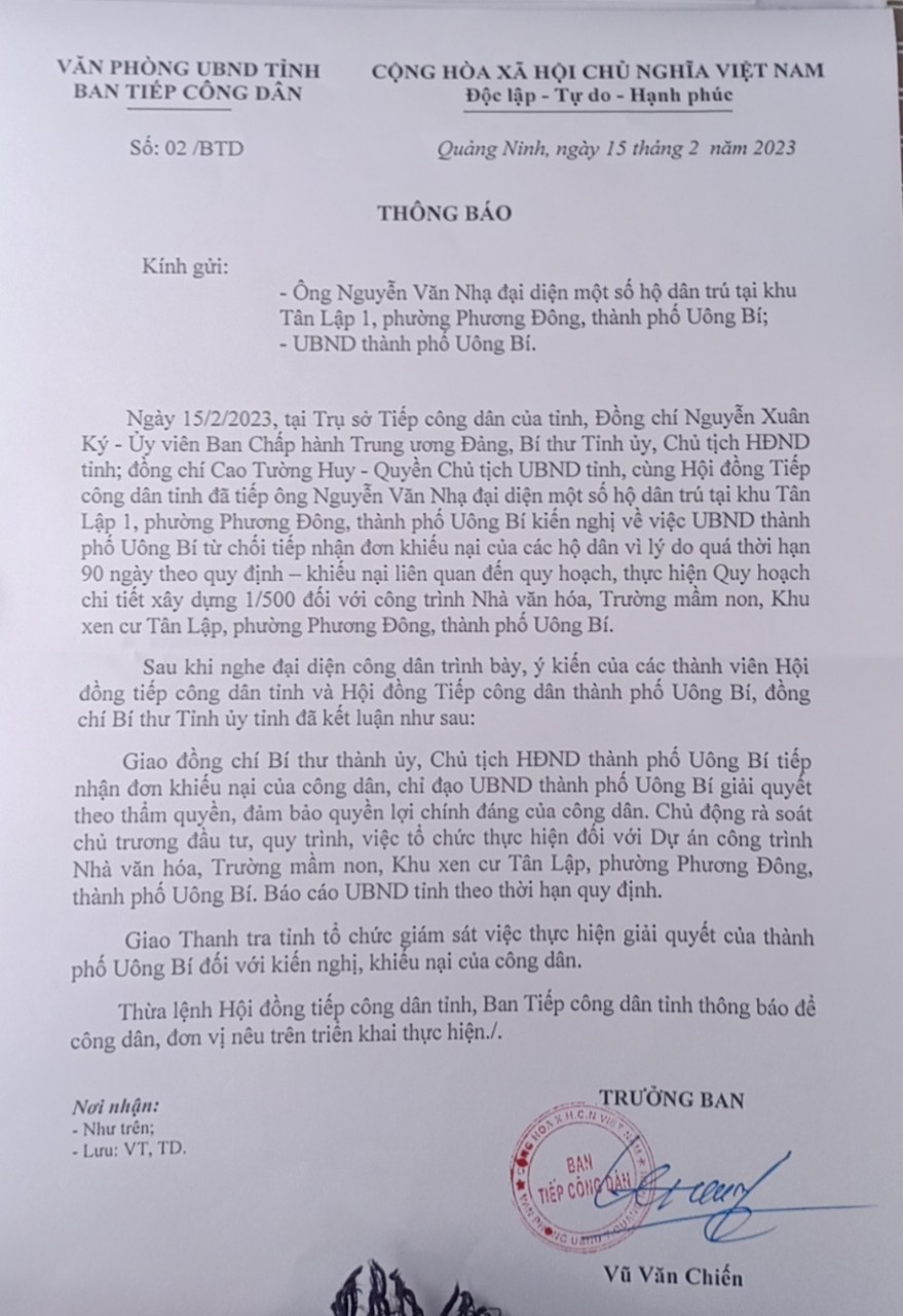 Thông báo số 02/BTD có nội dung như sau: “Ngày 15/2/2023, tại Trụ sở Tiếp công dân của tỉnh, Đồng chí Nguyễn Xuân Ký - Ủy viên Ban Chấp hành Trung ương Đảng, Bí thư Tỉnh ủy, Chủ tịch HĐND tỉnh; đồng chí Cao Tường Huy - Quyền Chủ tịch UBND tỉnh, cùng Hội đồng Tiếp công dân tỉnh đã tiếp ông Nguyễn Văn Nhạ đại diện một số hộ dân trú tại khu Tân Lập 1, phường Phương Đông, thành phố Uông Bí kiến nghị về việc UBND thành phố Uông Bí từ chối tiếp nhận đơn khiếu nại của các hộ dân vì lý do quá thời hạn 90 ngày theo quy định – khiếu nại liên quan đến quy hoạch, thực hiện Quy hoạch chi tiết xây dựng 1/500 đối với công trình Nhà văn hóa, Trường mầm non, Khu xen cư Tân Lập, phường Phương Đông, thành phố Uông Bí.