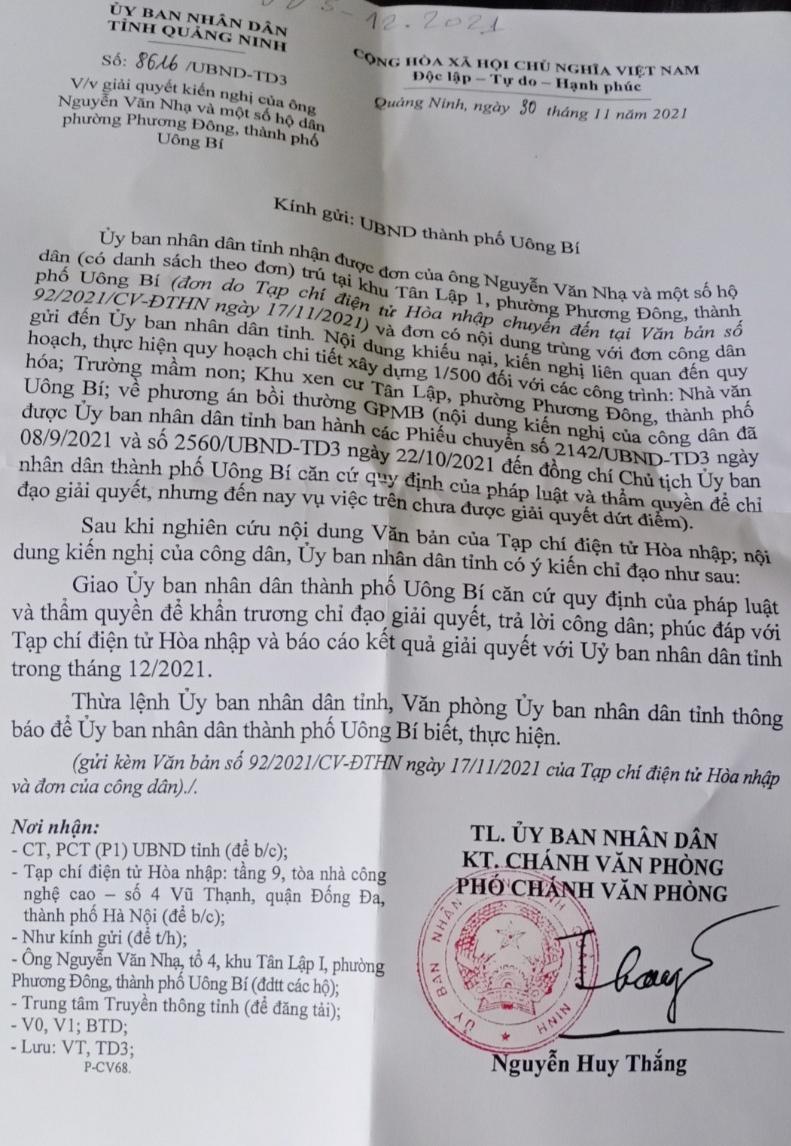 Sau đó, ngày 30/11/2021, UBND tỉnh Quảng Ninh có văn bản số 8616/UBND- TD3 gửi UBND thành phố Uông Bí V/v: Giải quyết kiến nghị của ông Nguyễn Văn Nhạ và một số hộ dân phường Phương Đông, thành phố Uông Bí. Văn bản này có đoạn ghi: “Sau khi nghiên cứu nội dung văn bản của Tạp chí điện tử Hòa nhập; nội dung kiến nghị của công dân, Ủy ban nhân dân tỉnh có ý kiến chỉ đạo như sau: