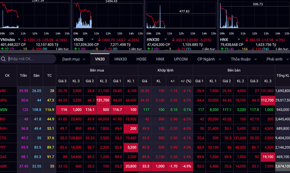 Chỉ số VN-Index giảm 55,76 điểm (-4,14%) xuống 1.291,38 điểm. Thanh khoản đạt 19.209 tỉ đồng.