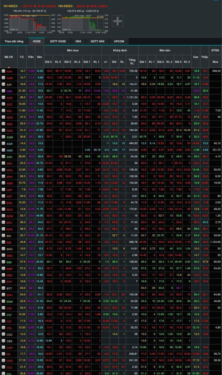 Đóng cửa phiên chiều 9/7, sàn HoSE có tới 306 mã giảm, trong đó 42 mã giảm sàn và chỉ 77 mã tăng, VN-Index giảm 27,54 điểm (-2,00%), xuống 1.347,14 điểm. Tổng khối lượng giao dịch đạt hơn 760 triệu đơn vị, giá trị 25.710 tỷ đồng, tăng 37,67% về khối lượng và 27,29% về giá trị so với phiên ngày 8/7.