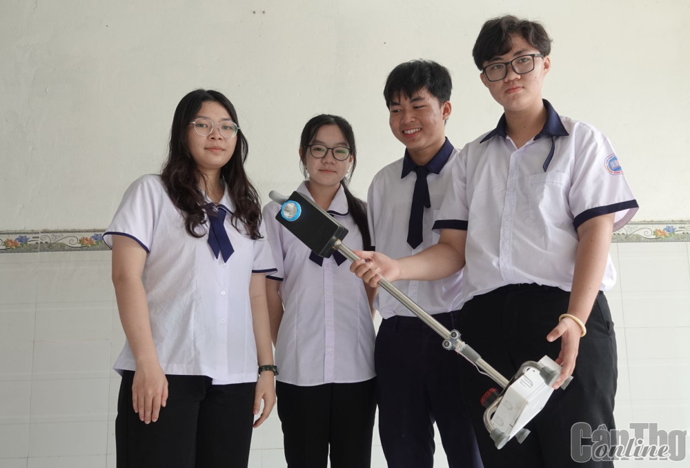 Học sinh Trường THPT Phan Văn Trị, huyện Phong Điền, với giải pháp BASTICK - chiếc gậy thông minh hỗ trợ người cao tuổi. Ảnh: Báo Cần Thơ.