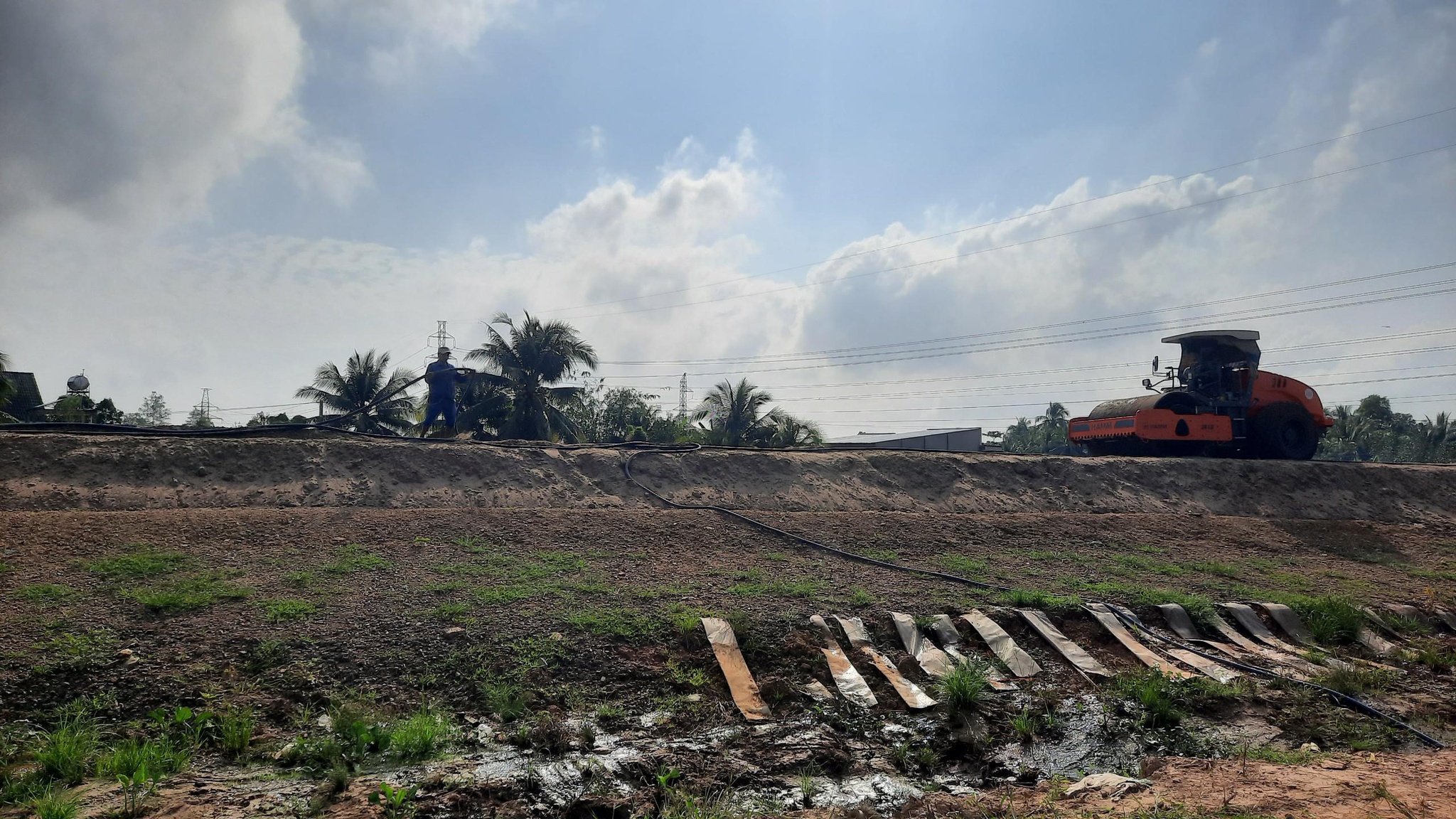 Xe đang lu cát phần đường dẫn cầu Mỹ Thuận 2
