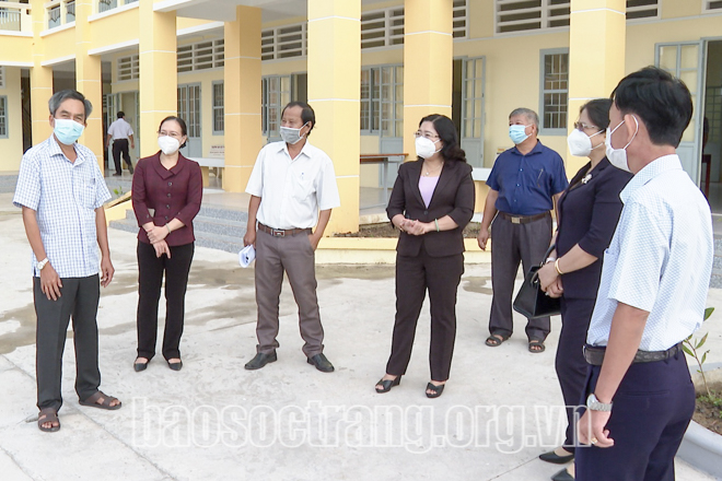 Đồng chí Hồ Thị Cẩm Đào - Phó Bí thư Thường trực Tỉnh ủy, Chủ tịch HĐND tỉnh Sóc Trăng (thứ 4 từ phải qua) kiểm tra tình hình dạy và học tại Trường THPT Mỹ Hương, huyện Mỹ Tú (Sóc Trăng). Ảnh: KIM SANG