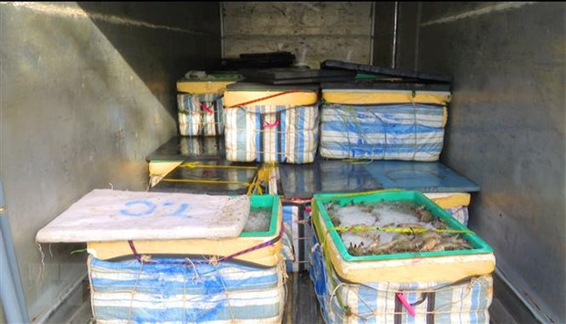 Xe tải vận chuyển hơn 1 tấn tôm có chứa tạp chất. Ảnh: TTXVN phát