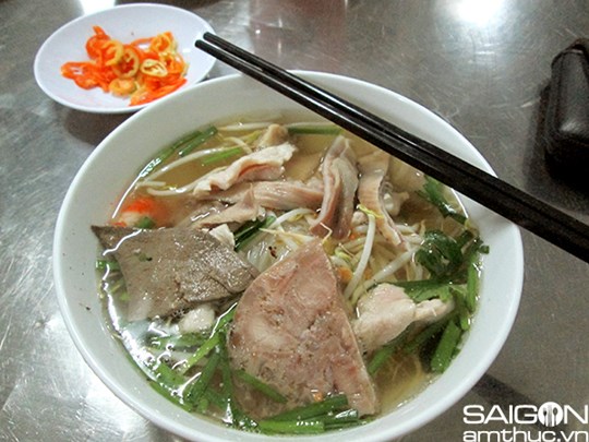 Mà đâu chỉ có pa tê, tô hủ tiếu đầy đủ còn kèm thịt nạc xắt lát, bao tử giòn, lát gan mỏng, phèo non và đôi khi còn có cả tôm lột, nhìn hấp dẫn vô cùng. Nước lèo thì ngọt béo, đậm đà vị thịt, ngửi thôi cũng đã thấy ngon rồi. Rau ăn kèm có giá, xà lách tươi xanh. Một tô hủ tiếu như vậy có giá khoảng tầm 25.000 – 30.000 đồng.
