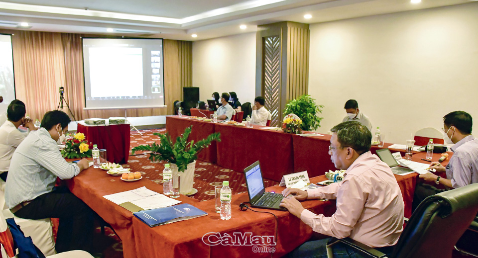 Các đại biểu dự Hội thảo trực tuyến tổng kết dự án “Hỗ trợ phát triển hệ thống canh tác hữu cơ và du lịch sinh thái kết hợp nông nghiệp cho cộng đồng nông dân quy mô nhỏ tại các tỉnh phía Nam khu vực sông Mê Kông” tại điểm cầu Cà Mau, ngày 30/12.