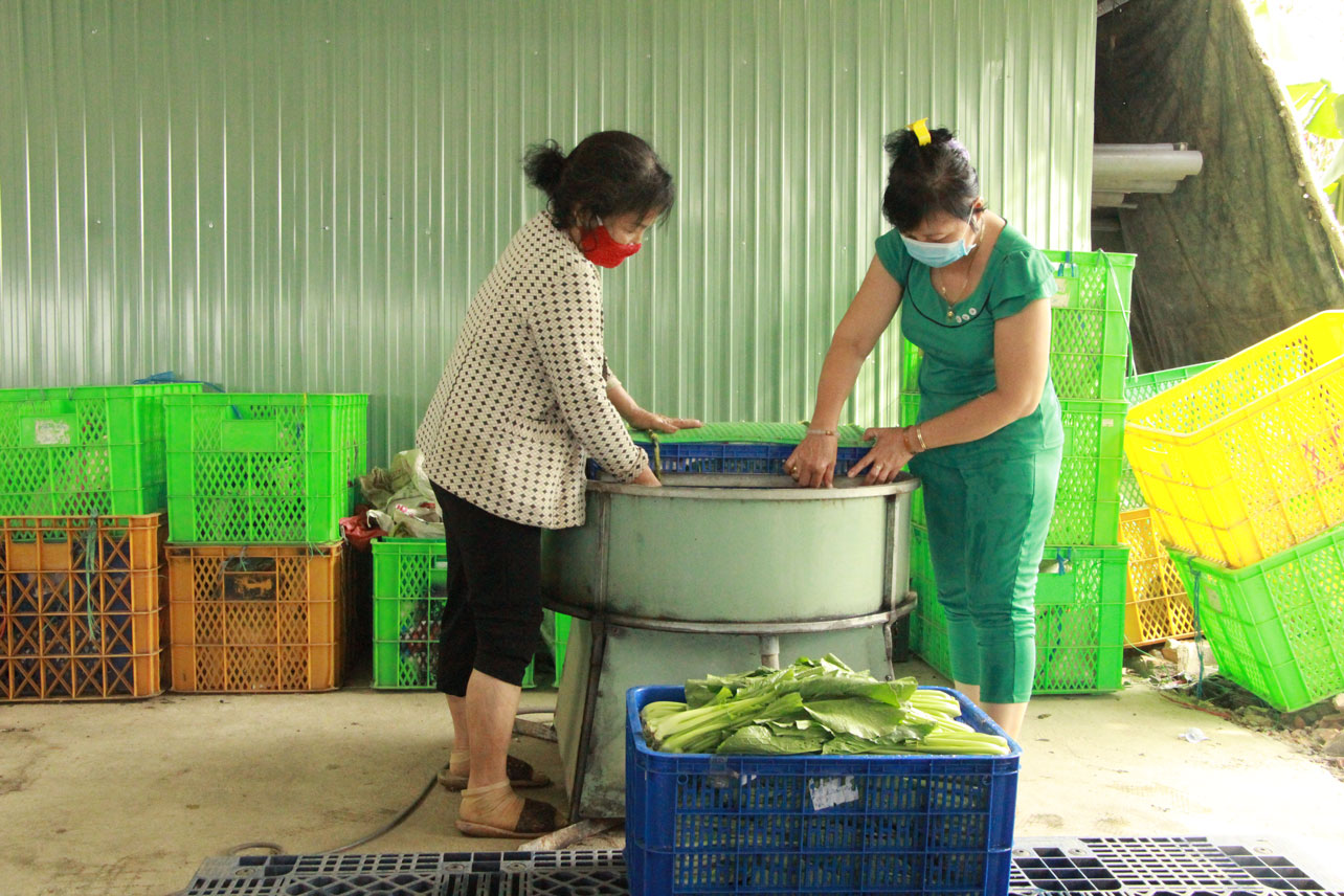 Chỉ vào máy vắt rau đang hoạt động, ông tự hào: “Máy này tôi làm đi làm lại, vừa làm, vừa cải tiến mấy lần mới được. Năm 2020, tôi tham gia Hội thi Nhà nông sáng tạo kỹ thuật và được giải Khuyến khích cấp tỉnh”. Máy vắt rau do ông Mười Hai sáng chế sử dụng lực ly tâm để vắt khô nước bám trên lá rau sau khi rửa, giúp việc bảo quản được lâu hơn. Máy vắt có ưu điểm làm khô nước trên mặt lá rau nhanh nhưng không làm gãy, giập hay ảnh hưởng đến chất lượng rau. Trước đây, khi chưa có máy, rau được hong gió sau khi rửa, vừa mất thời gian, vừa khiến rau dễ bị héo. Máy vắt rau vận hành hiệu quả giúp tiết kiệm thời gian sơ chế rau. Không chỉ sáng chế ra máy vắt rau, ông Mười Hai còn nghĩ ra hệ thống rửa với nước sục ozone giúp rau được làm sạch một cách tốt nhất. Thay vì đầu tư hệ thống máy rửa rau, củ, quả công nghiệp sục ozone, ông Mười Hai mua máy tạo ozone và tự mày mò, thiết kế bể chứa. Một hệ thống máy rửa rau với nước sục ozone “made in HTX Rau sạch Mười Hai” ra đời và vận hành hiệu quả.