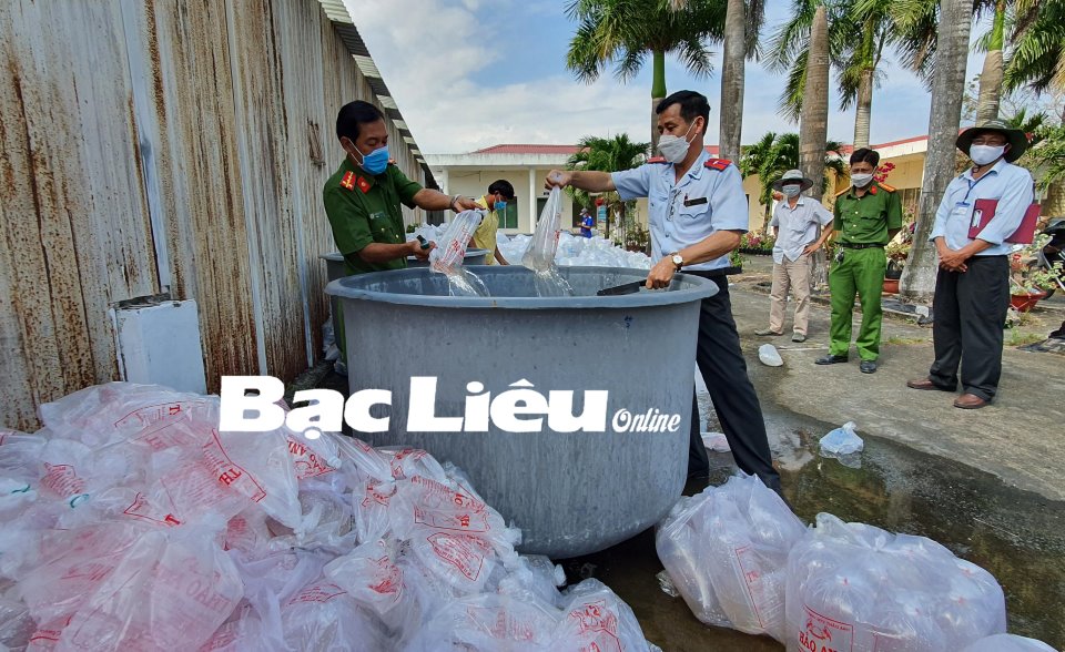 Trước đó, rạng sáng cùng ngày, lực lượng liên ngành tổ chức kiểm tra đột xuất hàng chục xe tải vận chuyển tôm giống từ các tỉnh miền Trung vào địa bàn tỉnh tiêu thụ tại khu vực chợ tôm (Phường 1, TX. Giá Rai). Qua đó, phát hiện 2 xe tải mang biển kiểm soát tỉnh Ninh Thuận, 1 xe mang biển kiểm soát tỉnh Khánh Hòa đang chở số lượng lớn tôm giống (tôm thẻ) chưa qua kiểm dịch.