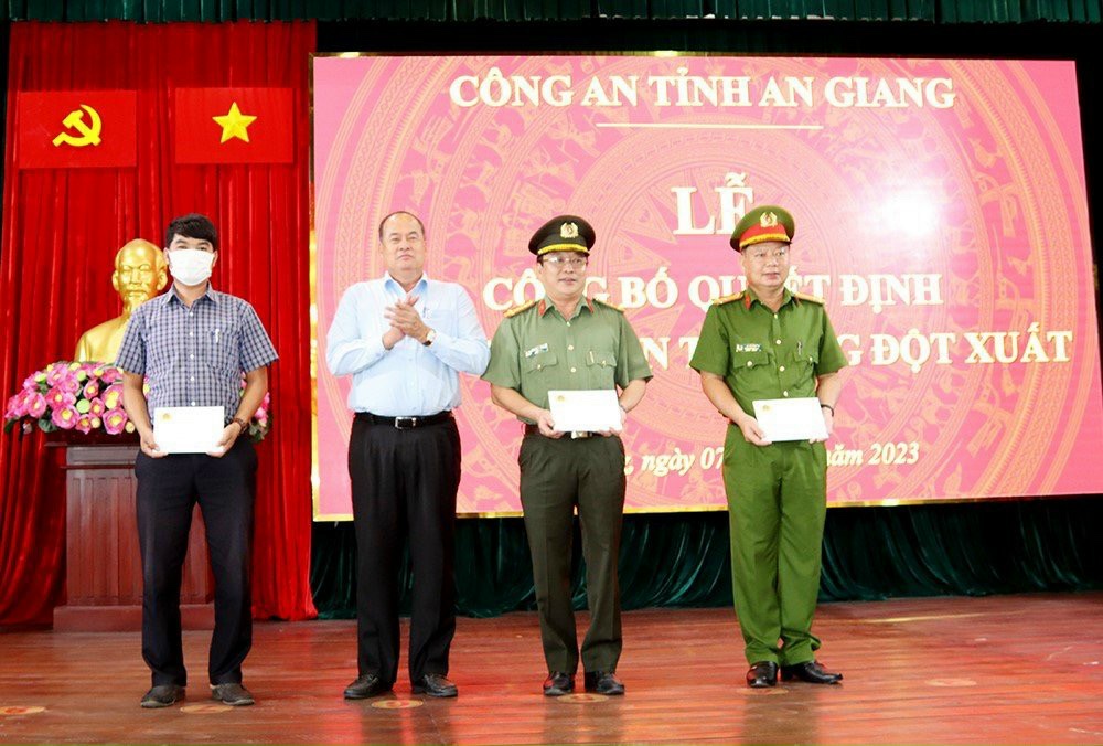 Sáng 7/3, Công an tỉnh An Giang tổ chức lễ công bố quyết định khen thưởng đột xuất của Chủ tịch UBND tỉnh An Giang đối với các tập thể và cá nhân có thành tích xuất sắc trong tham gia phá nhanh vụ vận chuyển trái phép 18,6kg chất ma túy từ nước ngoài vào Việt Nam xảy ra ngày 3/3, tại khu vực biên giới của tỉnh An Giang.
